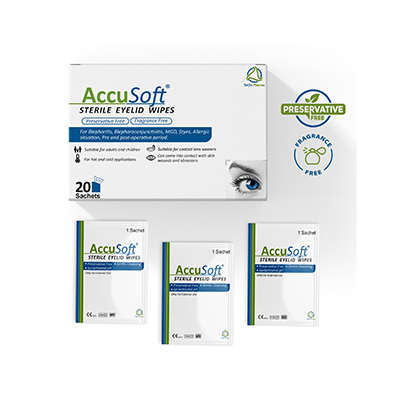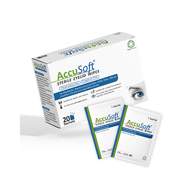 AccuSoft sterile disposable wipes are soaked in a natural solution, suitable for use around the eyes, they have iso-lacrimal pH, detergent and emollient characteristics AccuSoft sterile disposable wipes normalize the presence of bacteria on the skin.
